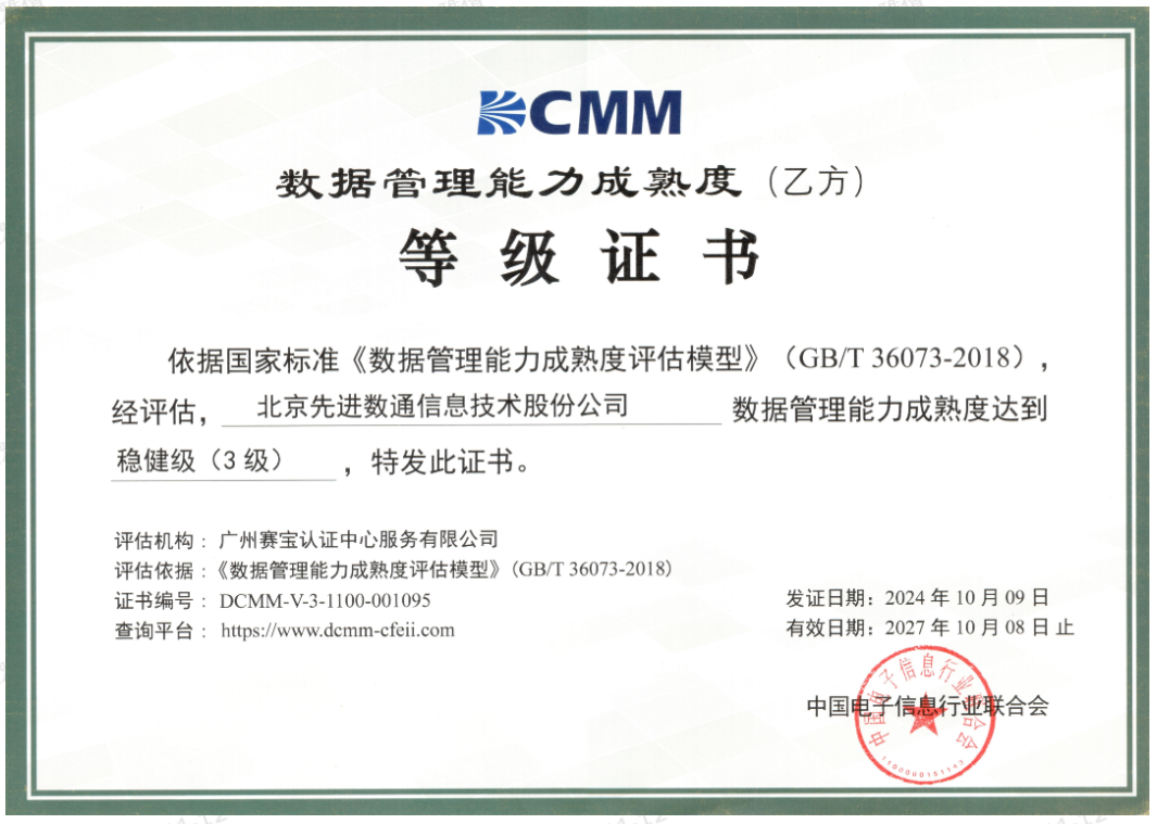 近期,中国电子信息行业联合会公布了最新一批顺利获得数据管理能力成熟度(DCMM)贯标等级认证的企业名单。PA真人视讯成功取得数据管理能力成熟度稳健级(三级)认证。这一认证的取得,标志着PA真人视讯在数据治理体系构建和数据管理与应用能力方面,已经达到了国家权威组织认可的标准。这不仅是对PA真人视讯在数据管理领域专业能力的肯定,也是对其在有助于数字化转型服务和数据驱动决策方面所做努力的认可。